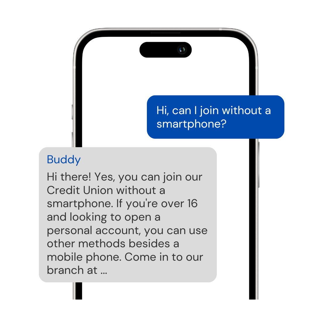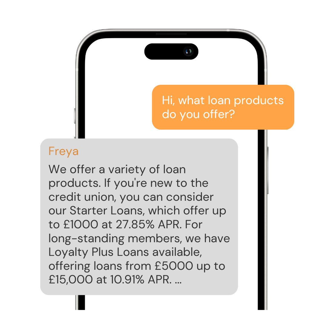 All colours, chatbot names, icons, including your loans and savings products, and branch details are bespoke to each mutual. If you have specific queries unique to your mutual, we can add these too. Bespoke branding ensures a consistent and smooth user experience when navigating from your social media or website to engaging with the chatbot.